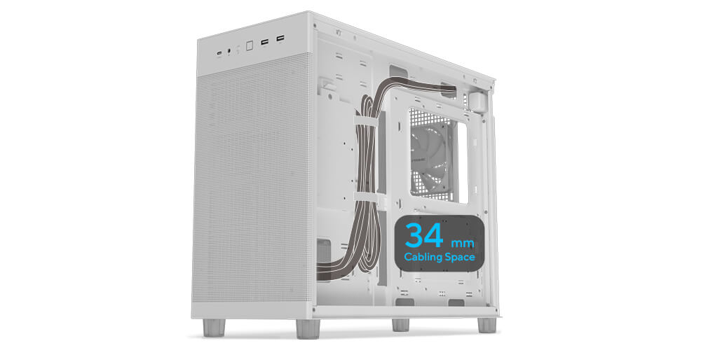 Отсек шириной 34 мм за материнской платой предоставляет достаточно места для аккуратной укладки кабелей, несмотря на относительно компактные размеры корпуса.