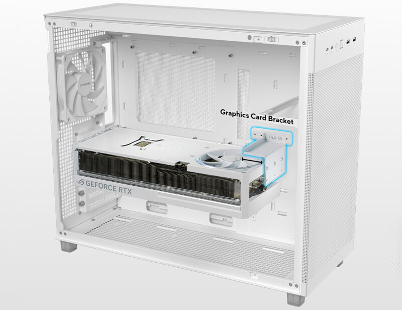 Вместе с держателем видеокарты предусмотрен кронштейн для видеокарт серии GeForce RTX 50 длиной от 310 до 360 мм. Он надёжно фиксирует видеокарту винтами, уменьшая провисание и смещение.
