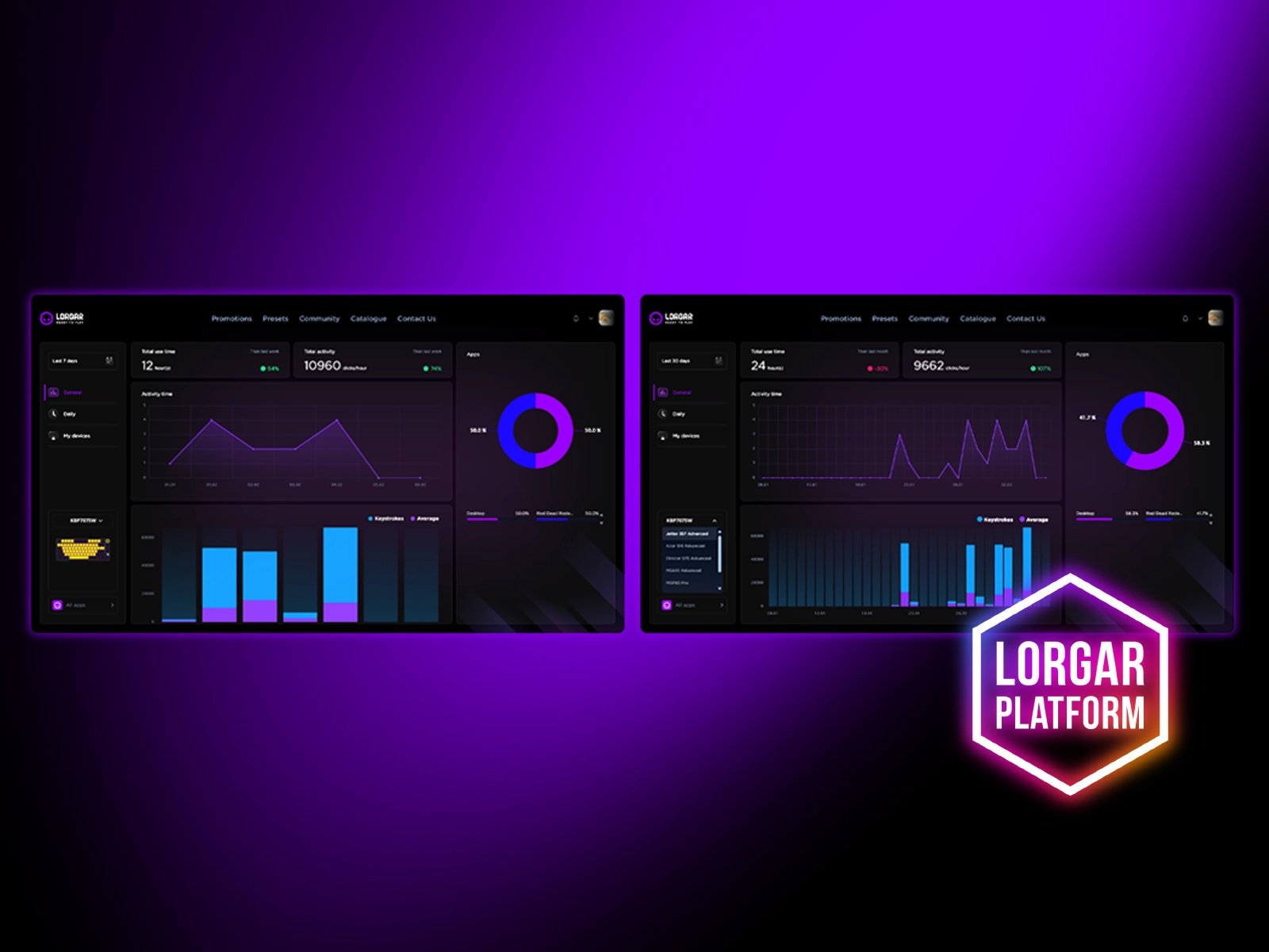 Следи за своими игровыми сессиями через панель аналитики платформы LORGAR™. Отслеживай ежедневную интенсивность игр и анализируй подробную статистику использования клавиатуры. Получай полезные метрики для улучшения результатов и оптимизации твоего сетапа.