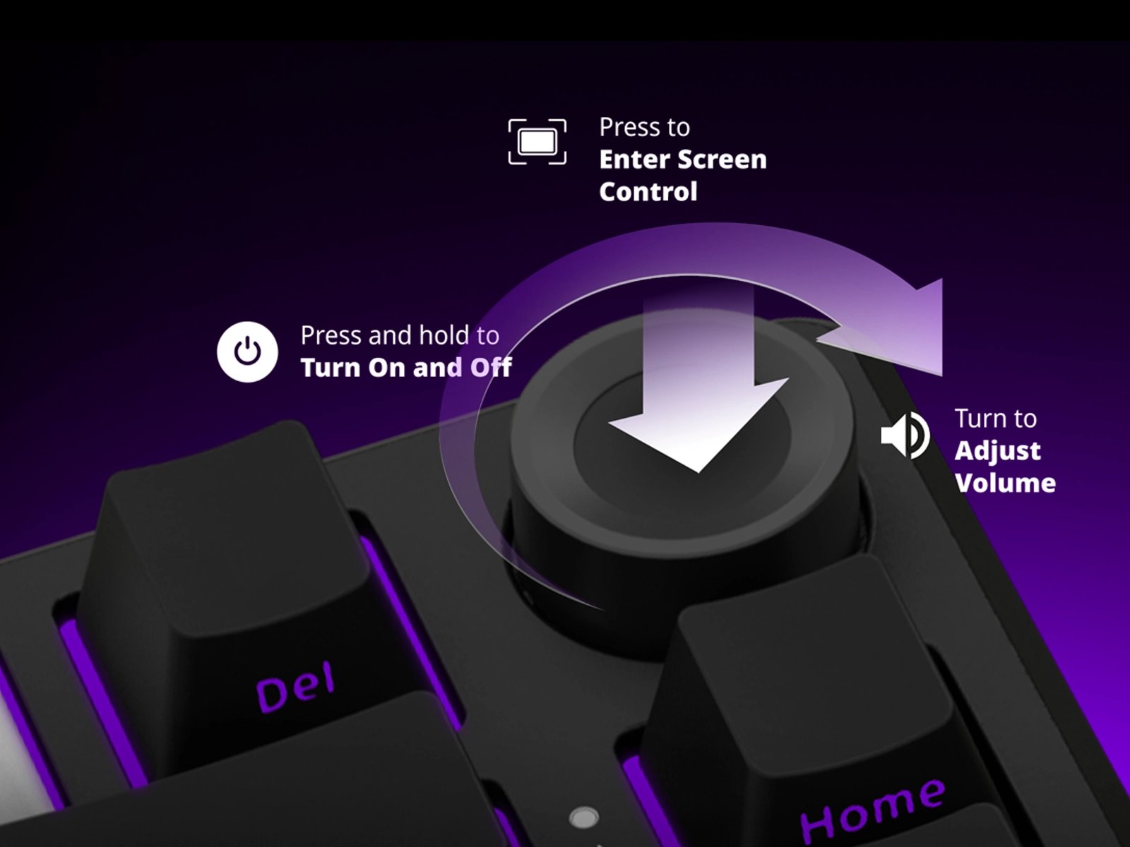 Многофункциональный контроллер для удобного управления на лету. Поворот регулирует громкость, а длительное нажатие (3 секунды) включает или выключает клавиатуру. Также с помощью ручки можно быстро переключаться между режимами подключения.