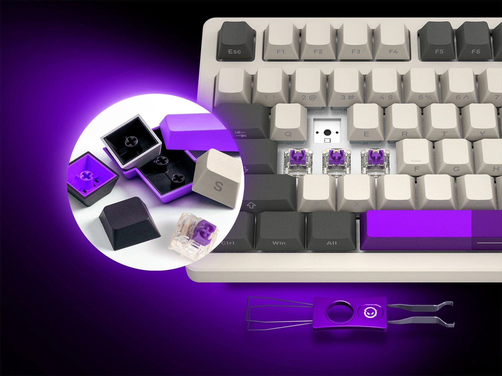В комплект входят: брелок-переключатель с колпачком, который можно заменить на любую клавишу клавиатуры; шесть запасных кейкапов в стиле вашей модели; пять запасных переключателей; кисточка для чистки клавиатуры, чтобы устройство всегда оставалось в идеальном состоянии; универсальный инструмент для снятия переключателей и кейкапов для быстрой настройки; две грелки для рук — чтобы комфортно играть долго; подставка под чашку для рабочего стола и удобная сумка для транспортировки.