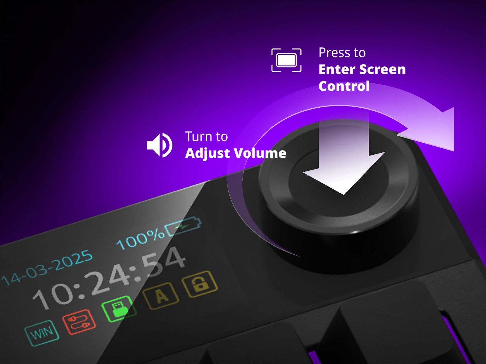 Многофункциональный контроллер для мгновенного доступа к настройкам клавиатуры и медиа. Поверни — и отрегулируй громкость, нажми — и открой меню для настройки подсветки: режимы, яркость, эффекты и цвета — всё под твоим контролем.