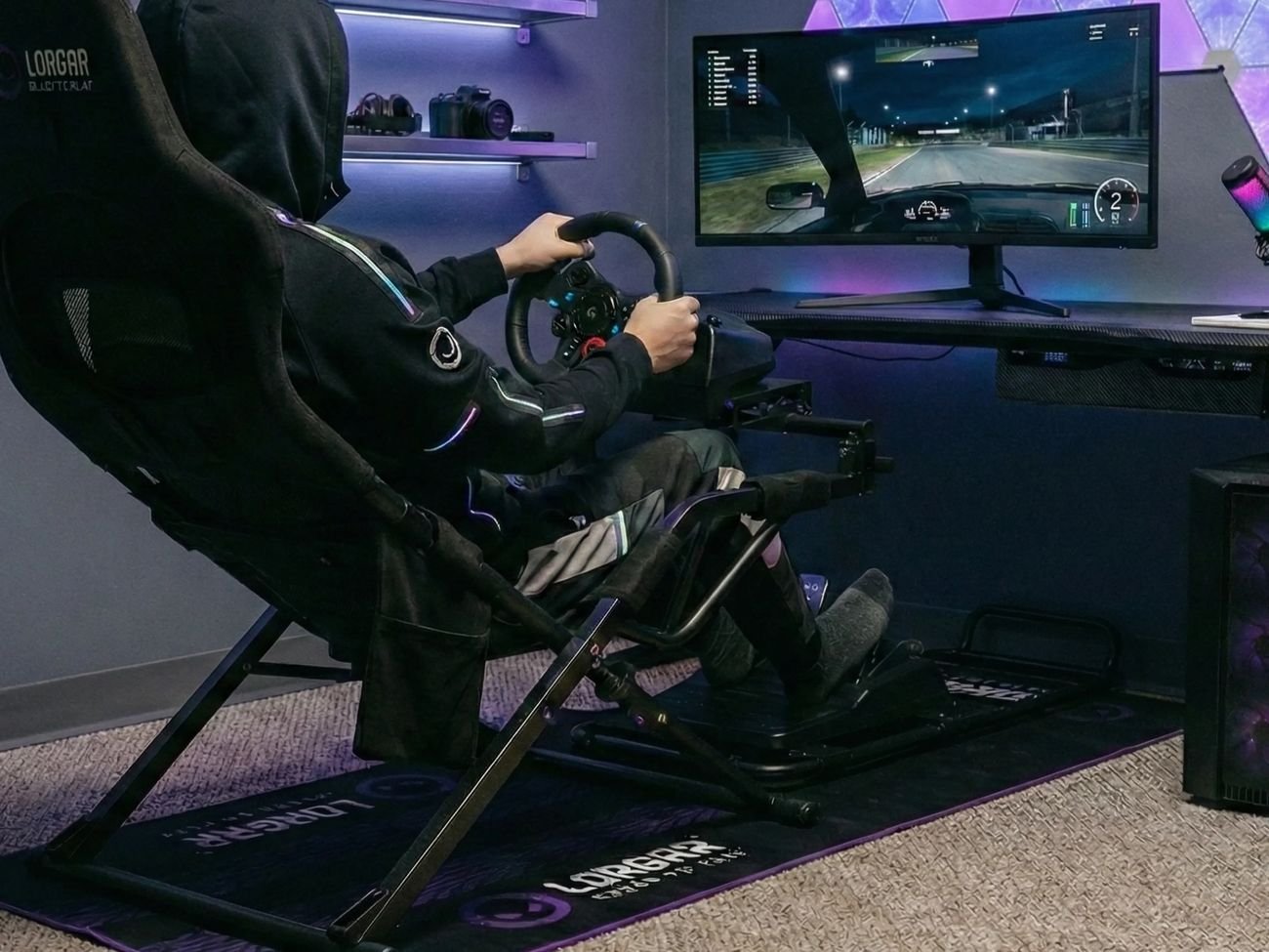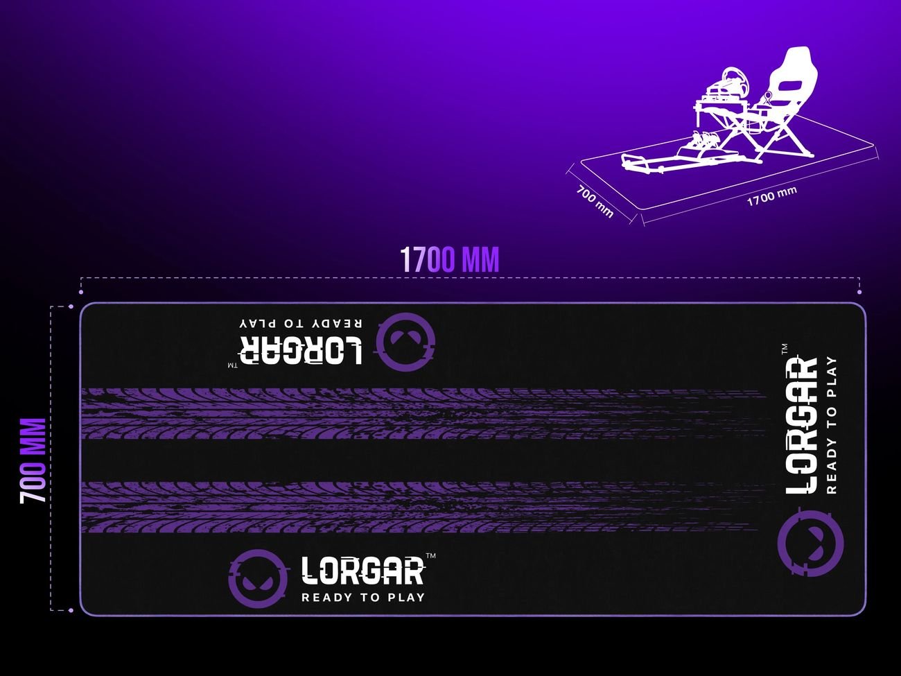Визуально RX1FM выполнен с рисунком протектора гоночной шины в фирменной чёрно-фиолетовой цветовой гамме LORGAR. В сочетании с брендингом LORGAR коврик формирует отдельную гоночную зону, которая визуально объединяет любой симрейсинговый сетап. Дизайн отлично сочетается со складным гоночным кокпитом LORGAR Advanced RAF1, создавая цельную гоночную атмосферу с самого основания.