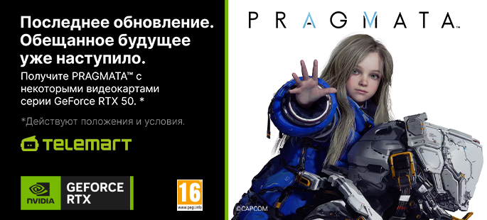 При покупке выбранных моделей видеокарт GeForce RTX 50 серии, а также ПК и ноутбуков на их базе в магазине Telemart получите код игры PRAGMATA в подарок.