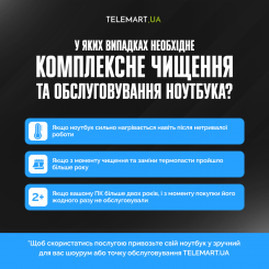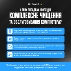- Почистіть комп'ютер. Під час розгону підвищується температура ОЗП, а потім і сусідніх комплектуючих. Щоб система охолодження ефективно виконувала свою роботу, прочистіть кулери від пилу. Не завадить і генеральне прибирання усередині корпусу ПК. До речі, з ПК просто: зняли кришку, демонтували кулери та інші комплектуючі, почистили від пилу щіточкою. З ноутбуком все не так просто. Якщо не хочете обтяжувати себе копанням у ноуті, звертайтесь до фахівців TELEMART.UA. Тим більше, що у нас є спеціальна послуга з комплексного чищення та обслуговування ноутбука (всего за 1399 грн.), як і комплексне чищення ПК із заміною розхідників (за 999 грн.).