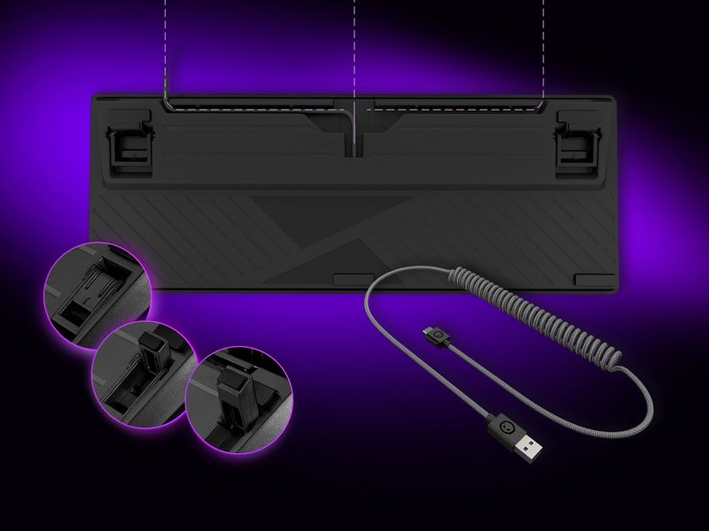 Azar 514TKL був розроблений з урахуванням зручності користувача, має трипозиційні прогумовані ніжки, знімні та гнучкі. Корпус 2 в 1 та знімний пружинний USB (C) – USB (A) кабель довжиною до 2,3 м має систему упорядкування кабелів для організації робочого простору.