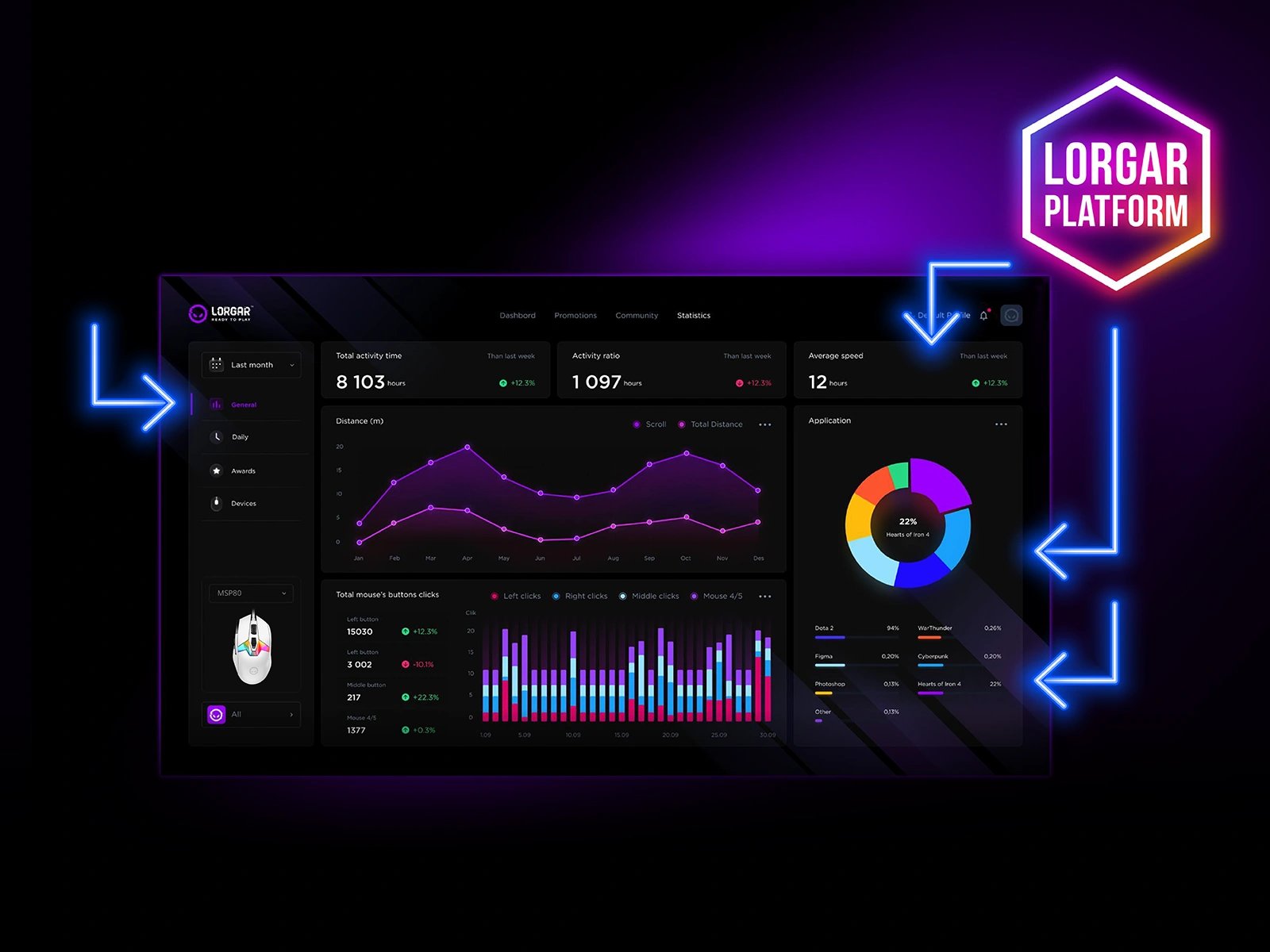 Відстежуйте свої ігрові сесії за допомогою аналітичної панелі LORGAR PLATFORM. Відстежуйте щоденну інтенсивність ігор і переглядайте детальну статистику про моделі використання вашої миші. Отримайте доступ до показників, щоб покращити результати та оптимізувати налаштування.