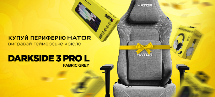 Купуй акційну периферію HATOR у магазині Telemart та бери участь у розіграші ергономічного геймерського крісла HATOR Darkside 3 Pro L Fabric Grey.